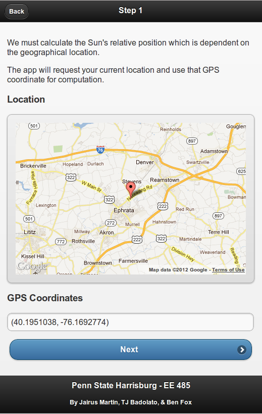 For one of my classes at Penn State we had to do a project that involved teaching or helping spread the word about energy. Our group decided to make an app to estimate how much energy a solar panel will save.The final product is a mobile website written in html & javascript using the jQuery Mobile framework. You can use it here: ee485.jairusmartin.com or click the image below. Go try it out!